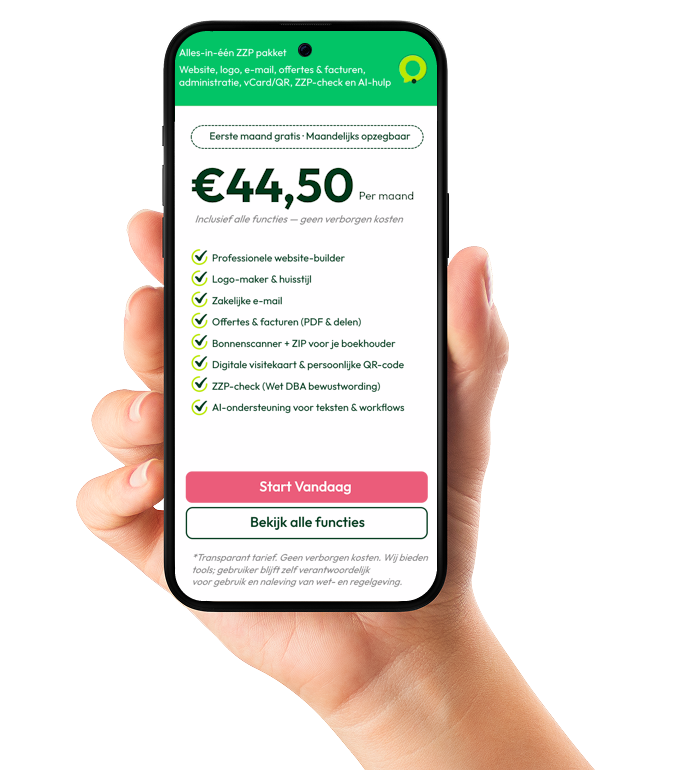 Als zzp’er werk je met veel verschillende tools: website, logo, offertes, facturen, administratie, e-mail en meer. Dat kan rommelig en tijdrovend zijn. Onze app bundelt alles op één plek, zodat jij overzicht houdt en sneller kunt werken.